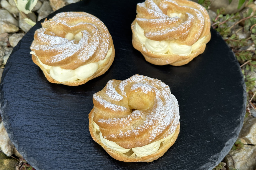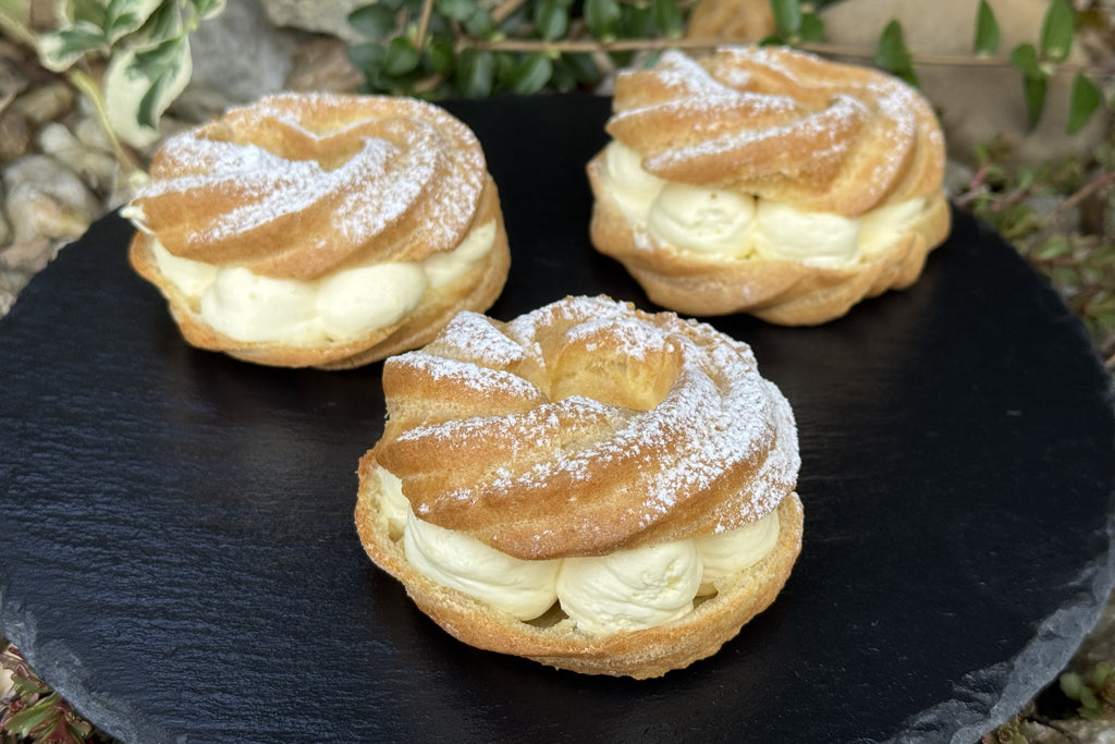 odpalované těsto (hladká mouka, vejce, voda, mléko, máslo, cukr, sůl)