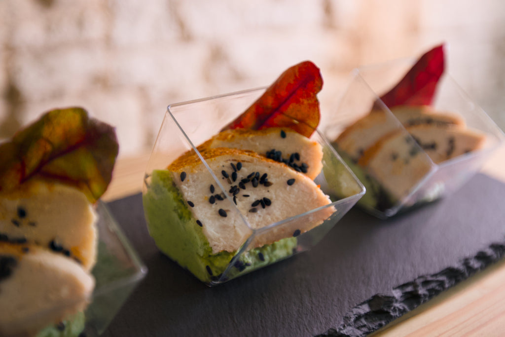 Kuřecí prsíčko na hráškovém pyré 8ks + Vepřová panenka na krému z červené řepy 8ks - 640,00 Kč