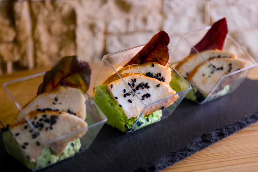 Kuřecí prsíčko na hráškovém pyré 8ks + Hummus se sušenými rajčaty 8ks - 600,00 Kč